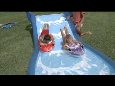 Aire de jeu Surf slide Gliss Party Intex Mesures: 4,42 m x 1,68 m x 1,63 m Une fontaine se conecte à un tuyau d´arrosage pour faciliter la glisse Inclus 2 body boards avec poignées